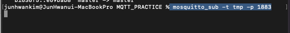 mosquitto가 실행이 됬으면 구독자를 실행시켜 줍니다. 구독자가 브로커의 포트번호인 1883포트에 연결하고 tmp라는 topic을 구독하겠다는 뜻입니다.