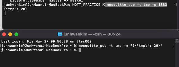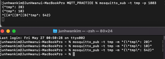 정상적으로 실행이 되었다면 구독자가 {"tmp":20} 이라는 데이터를 받은것을 볼 수 있을겁니다.