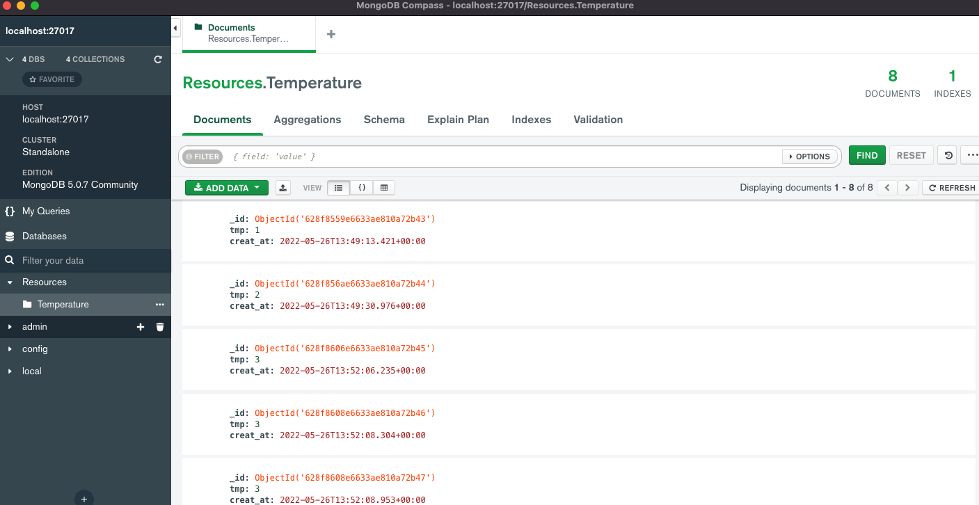 Resources라는 db를 생성해주고 Temperature라는 콜렉션을 생성해줍니다.