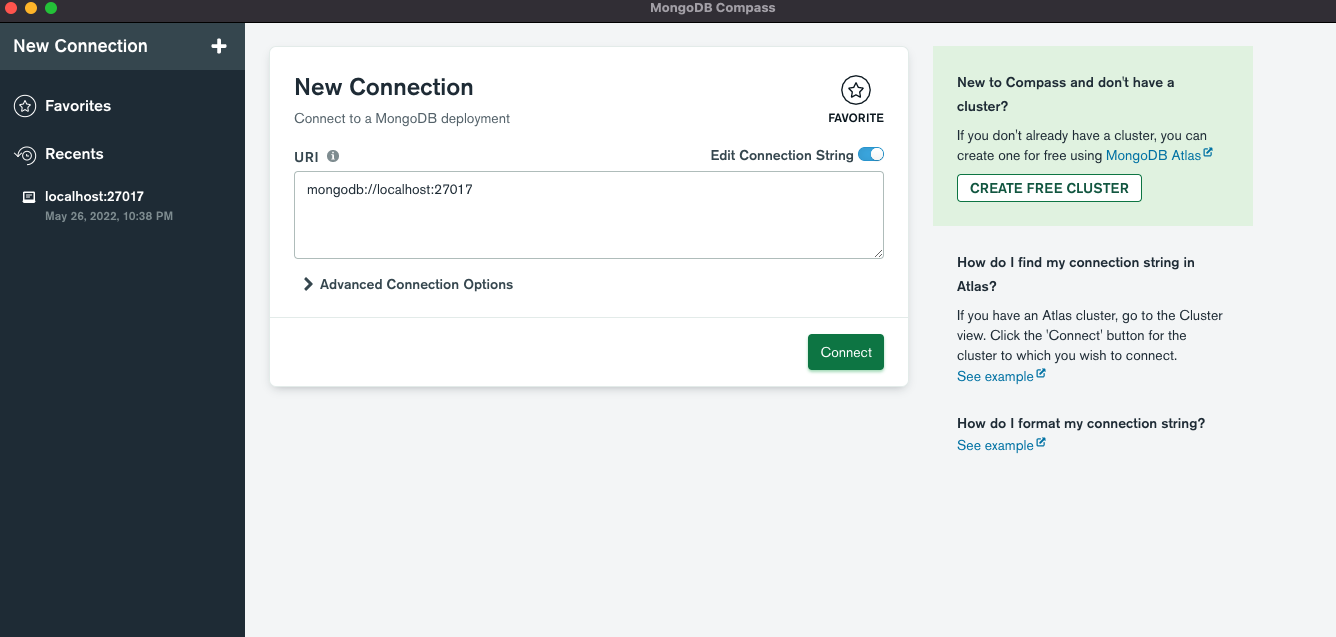 mongodb compass를 설치하면 이런 시작화면이 보입니다. Connect를 클릭하여 mongodb와 연결시켜줍시다. 만약 오류가 뜬다면 mongodb가 실행중인지 확인해보세요.