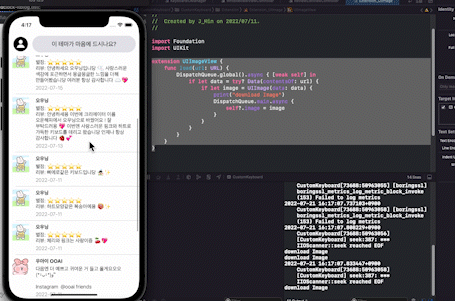 UIImage를 extension해서 셀의 이미지를 다운로드할 때 print를 찍어보았습니다. 셀이 reuse 되면서 계속해서 이미지를 다운로드 한다는걸 볼 수 있습니다. 테이블 뷰가 reuse 될때마다 계속 다운로드 하는것은 사용자의 많은 자원 소모와 앱의 성능 저하를 야기합니다. 이러한 문제를 해결하기 위해 NSCache를 이용합니다.