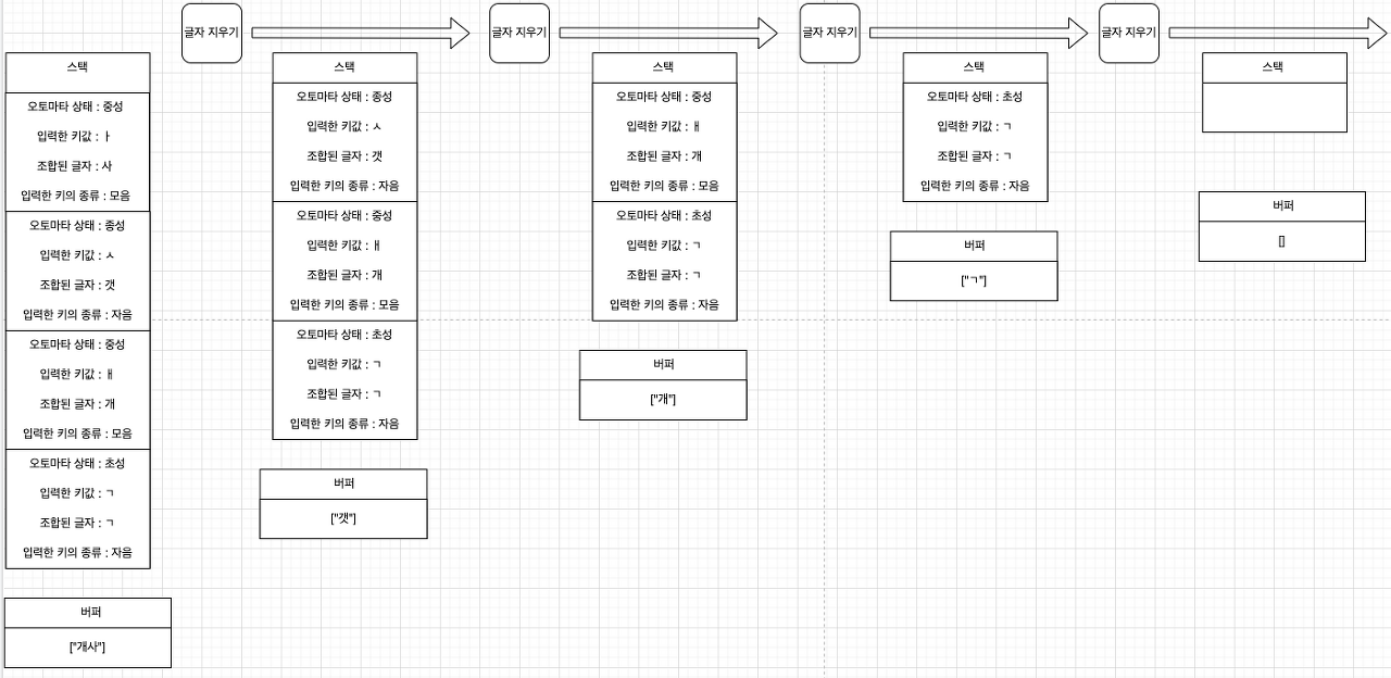 글자 지우는 방식 역시 위의 inpStack를 이용하여 여태까지 입력했던 상태를 저장합니다. 해당 스택의 제일 윗부분이 마지막에 입력한 오토마타의 상태가 되므로, 해당 상태에서 오토마타가 진행이 됩니다.