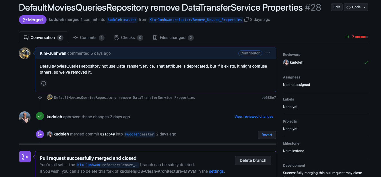 어떤식으로 코드를 작성했나 하고 소스코드 뜯어 보고 있었는데, 안쓰는 프로퍼티가 존재하길래 지우고 PR 보냈더니 되었다. 처음 경험해보았다. 그렇게 큰 프로젝트도 아니고 어려운 프로젝트도 아니지만, 2.9k 스타를 받은 프로젝트에 머지되니까 기분은 좋다.