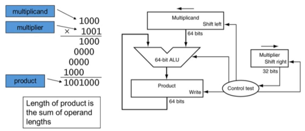 - product의 최하위 비트의 값이 1이면 add 연산 (multiplicand와 product의 상위 32비트 add연산) 실행 0일 경우 다음 순서로 이동