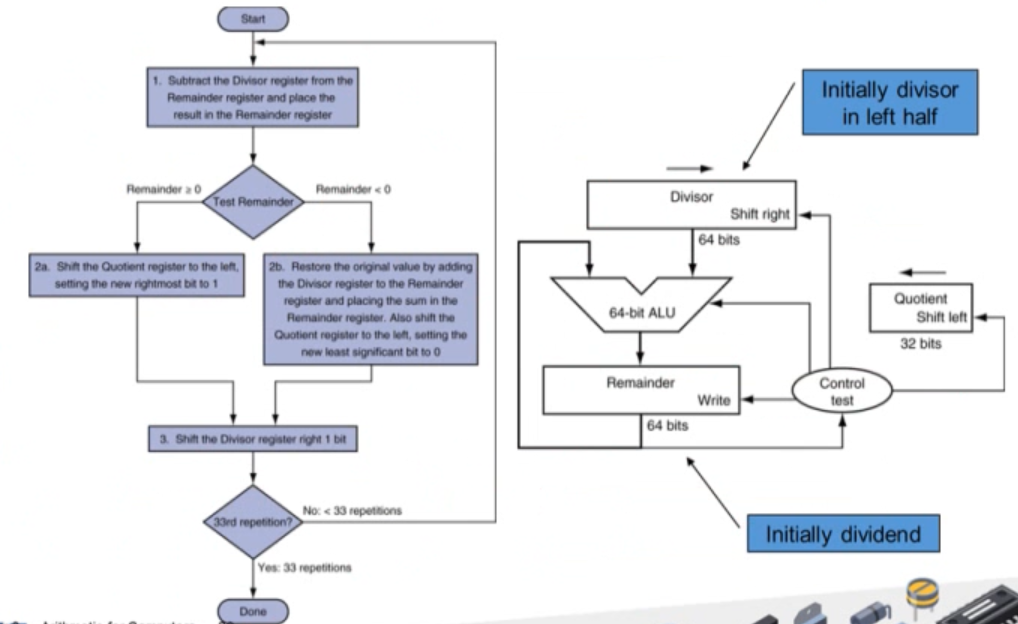 곱셈 하드웨어 구조와 비슷하지만, 시프트 연산이 다르다. 곱셈과 반대로 연산한다.