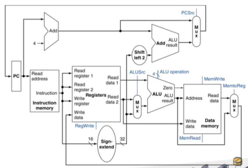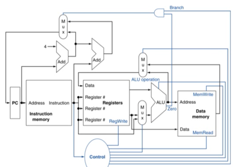 - 명령어에 따라 ALU 연산 또는 메모리로부터 load/ store 작업 수행, 브랜치 명령어 등등