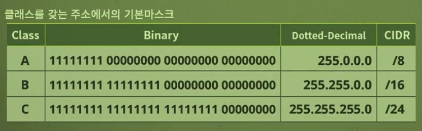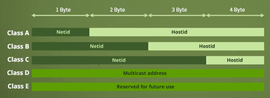 클래스 A, B, C는 일대일 통신으로 사용. 클래스 D는 멀티캐스트 통신으로 사용. 클래스 E는 앞으로 사용을 위한 예비용.