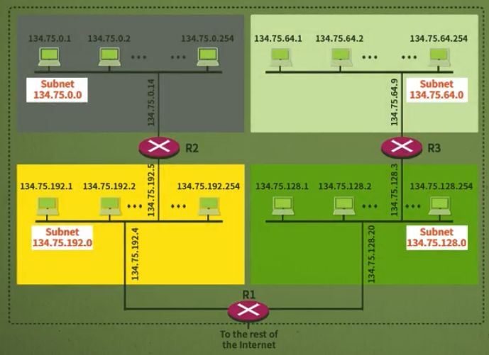 134.75.0.0과 같은 B클래스 주소를 서브넷을 이용하여 다음과 같이 모든 시스템에 할당 가능
