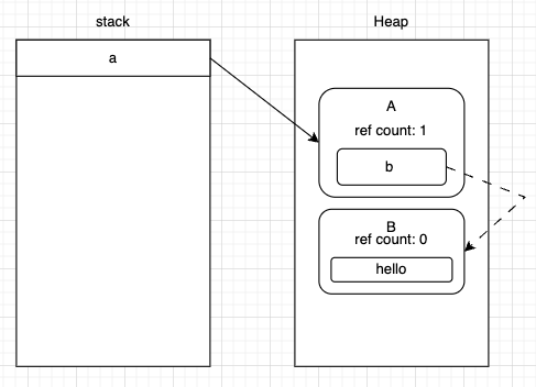 그 후 a의 b에 접근해 hello를 출력하려고 하면 이때 b가 초기화되면서 다음과 같은 상태가 될 것이다.