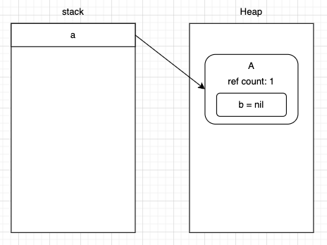하지만 초기화가 되었지만 weak 이기에 Reference Count가 증가하지 않으므로 0이 되면서 ARC에 의해 메모리에서 해제. A의 프로퍼티인 b는 nil이 되어버린다.