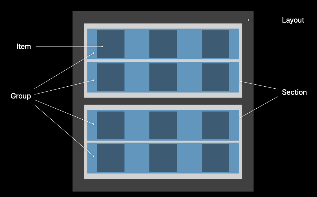 Compositional layout의 핵심은 group. group은 중첩이 가능하며 이를 이용해 복잡한 레이아웃을 만들 수 있다.