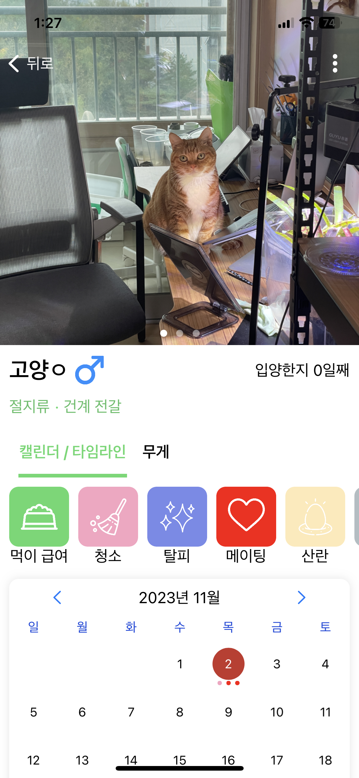그다음은 관리 목록을 기록하는 화면인데, 처음에는 사용자가 직접 작업을 정의해서 기록할 수 있게 하려고 했지만, 그럴 경우 여러 가지 고려해야 할 사항이 많아서 메모라는 작업을 넣어서 그 외의 작업은 메모를 이용하도록 기획했다.