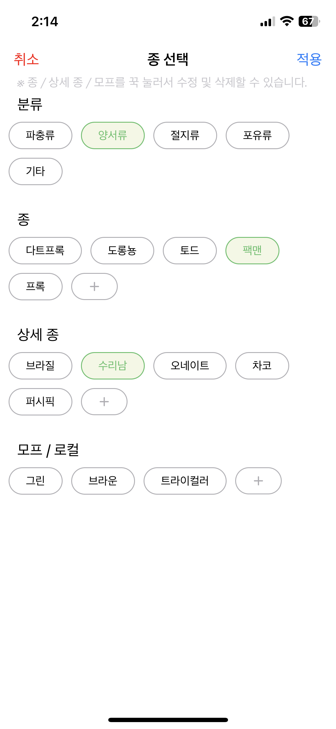희귀 애완동물의 경우 종이나 모프 같은 게 딱 정해져 있는 게 아닌 경우가 많다 보니, 사용자가 직접 추가 및 수정, 삭제할 수 있도록 구현했다. 일단 분류, 종을 필수로 선택해야지만 적용 버튼이 활성화되도록 해두었다.