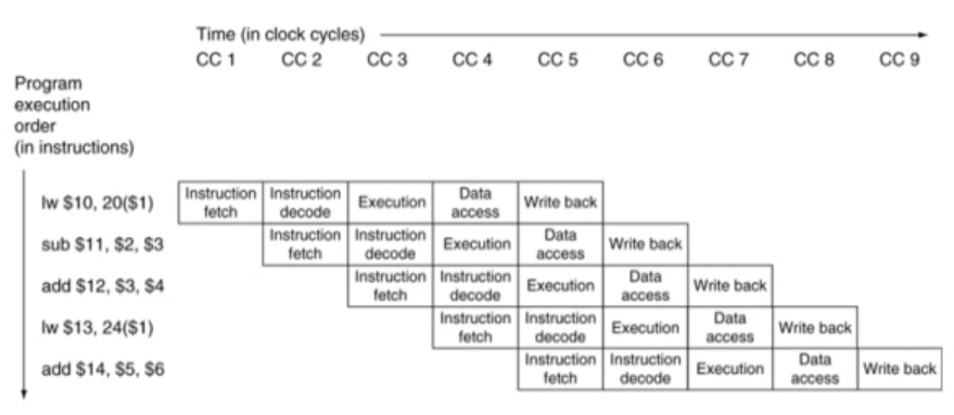 현재 예시의 사이클에서는 add, lw, add, sub, lw 총 5개의 명령어가 한 사이클에서 실행되는 상태. 파이프라인은 여러개의 명령어를 pararell 하게 실행시키기에 throughtput(시간당 작업량)을 증가시켜서 성능을 향상함