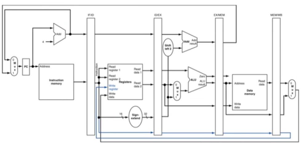 기존 Mips의 Pipe에서 Load 명령어를 실행한다면 WB스테이지에서 값을 가져온 후 레지스터로 되돌아온 후, 주소에 값을 저장하게 된다. 하지만 파이프라인을 사용할 시 해당 레지스터에는 다른 명령어의 주소값이 들어가 있게 되므로, 이를 해결하기 위해 load의 datapath(푸른 선)를 추가하여 문제를 해결. dataPath를 추가함으로써 단계가 진행될 때, 같이 데이터가 넘어가는 방식