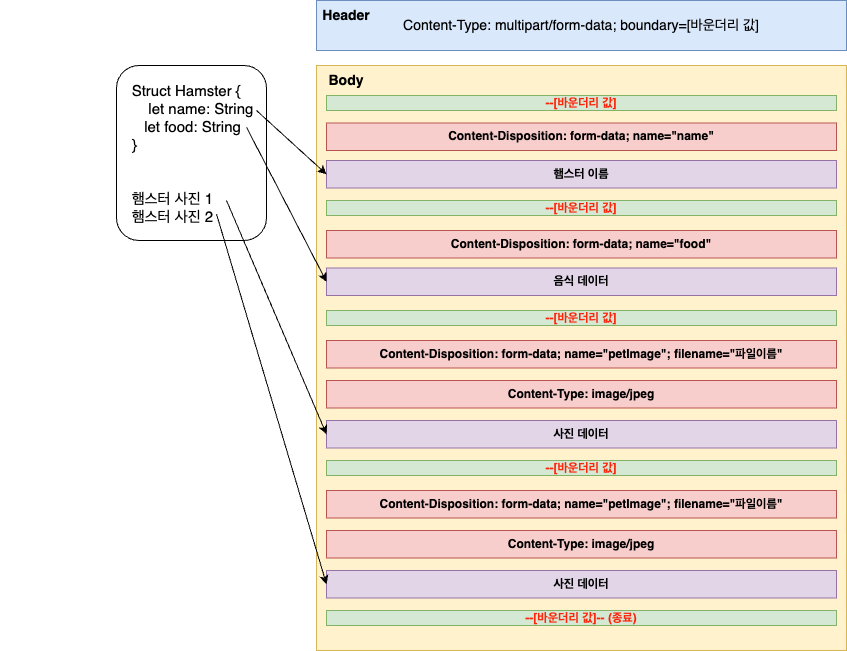 header의 boundary에 들어가는 값은 multipart의 나뉜 부분을 구분하기위해 사용되는 값이다. 이 boundary 값으로 데이터가 나뉜 부분과 어디서부터 시작이고 어디서부터 끝인지를 구분한다.