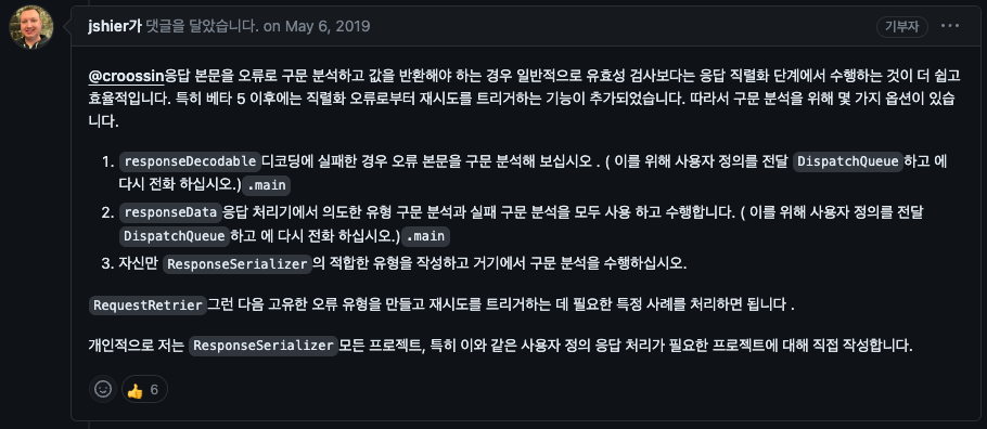 비슷한 사례가 있나 싶어서 issue에서 검색해 보니 alamofire 만든 사람도 Response Serializer를 만들어서 사용한다고 한다. validate는 가벼운 유효성 검사를 하는 것을 권장하고 있다.