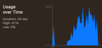 CollectionView의 셀을 계속해서 스크롤 해서 셀에서 이미지를 가져오는 작업을 했을 경우의 CPU 사용량입니다. 좌측 이미지가 이미지 작업을 cancel하지 않았을 경우, 우측이 이미지 작업을 cancel 했을 경우입니다. CPU의 사용량 차이와 스파이크의 차이가 나는 것을 볼 수 있습니다.