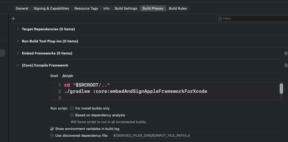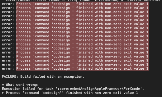 하단에 embedAndSIgnAppleFrameworkForXcode 작업을 실패했다고 하는데, 이 작업은 kmp/cmp 환경을 세팅할때, Build phases로 프로젝트가 빌드 될 때 같이 돌아간다.