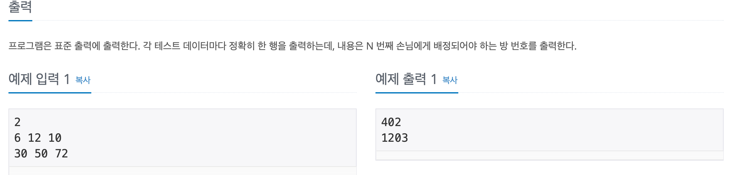 이 문제에서 주의할 점은 하나다. 꼭대기 층일때의 방 번호다. 일반적인 방 번호를 구하는 식은 손님의 번째 수 /층를 이용해 앞번호는 나머지, 뒷벗호는 몫+1 이지만 꼭대기 층일경우 몫은 1이 되서 2가 되버리고 나머지는 0이 되서 앞번호가 0이 되어버리기 때문이다. 이것만 주의하면 조금만 생각해도 풀 수 있는 문제.