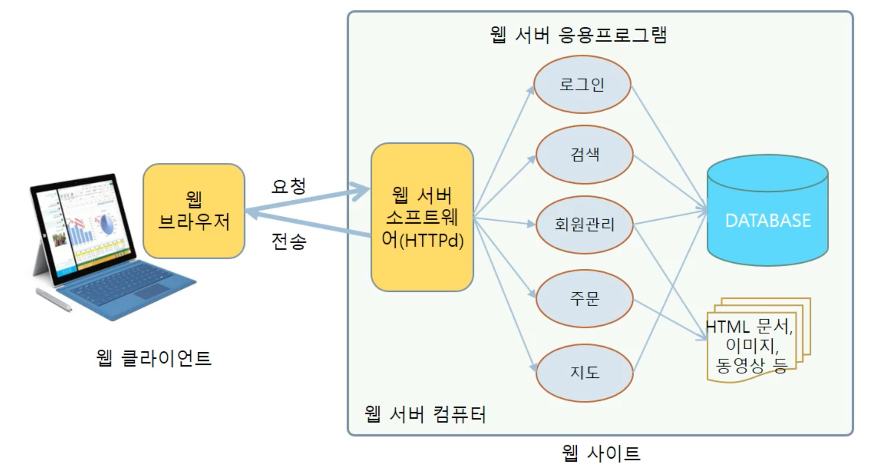 웹 브라우저의 요청을 해석해서 필요한 웹 서버 응용프로그램을 작동시킨다. 그리고 웹 서버 응용프로그램의 실행결과를 웹 브라우저로 전송한다.