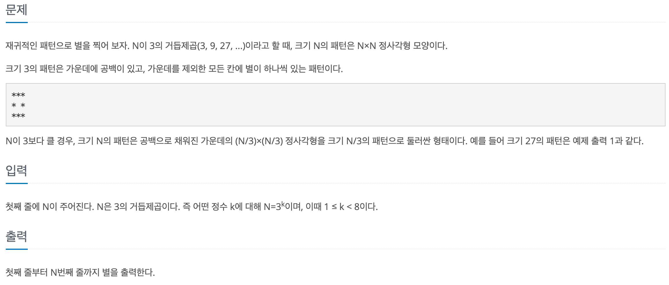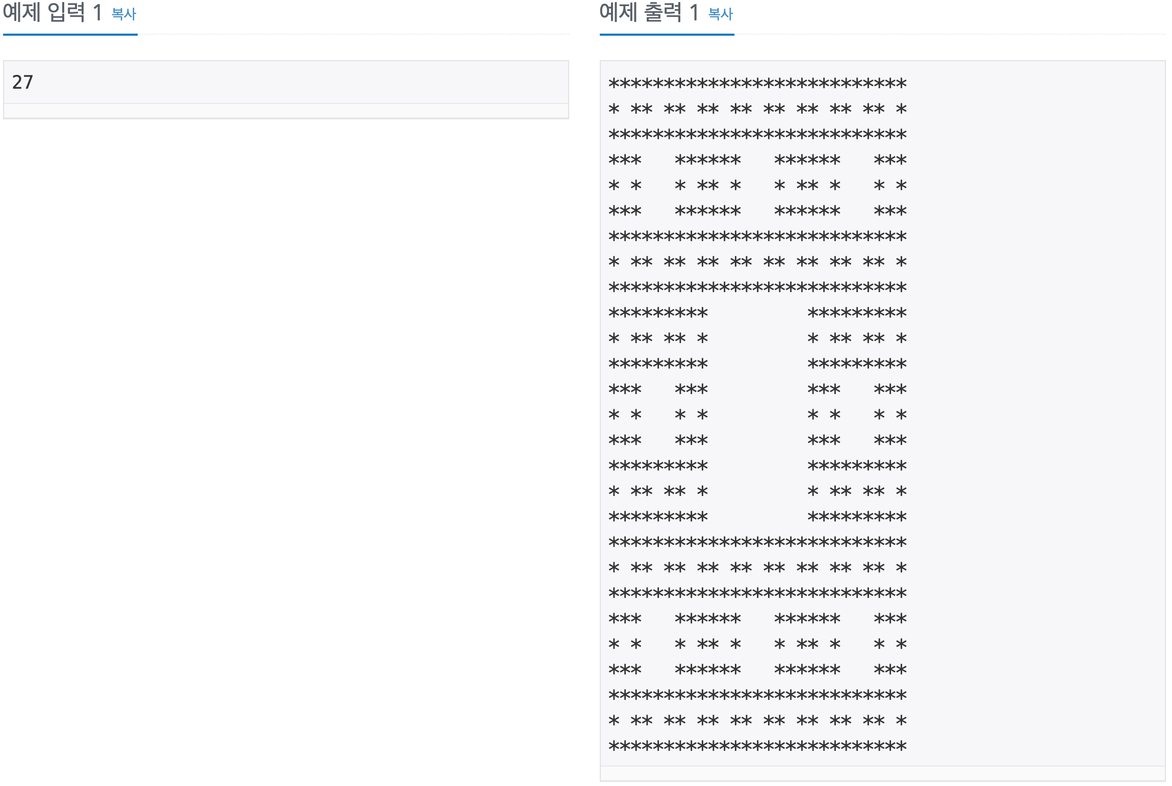 재귀를 이용한 별찍기다. 2시간정도 낑낑거리면서 풀었다. 누구나 규칙을 찾을수 있지만, 그것을 알고리즘으로 구현하는게 어려운 문제다.