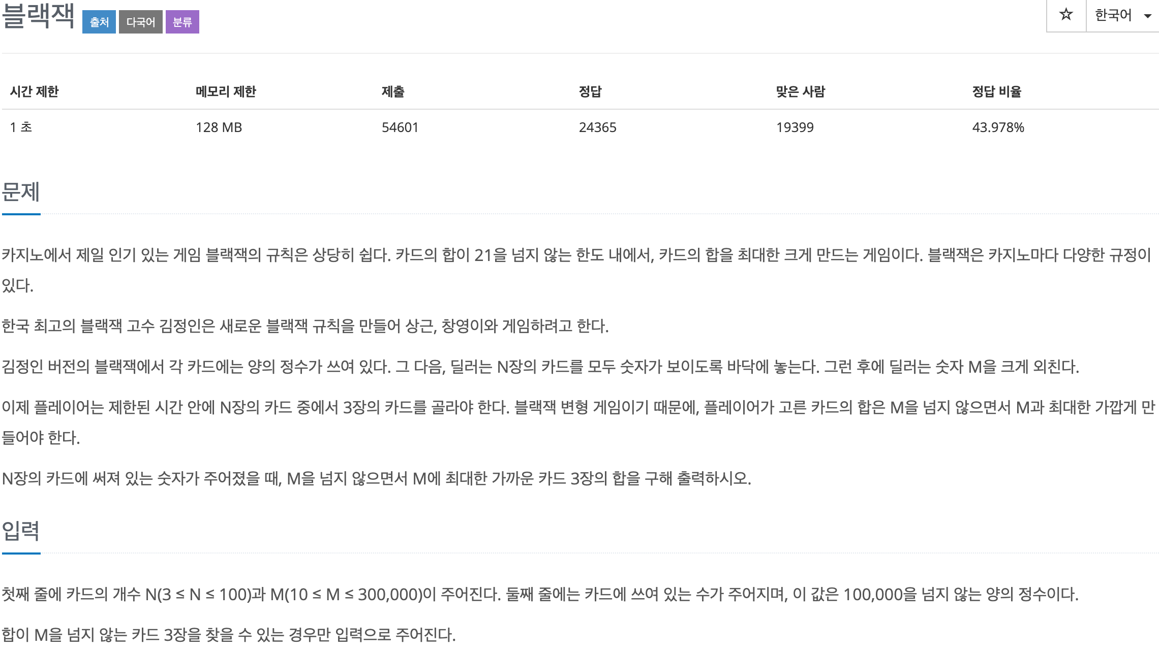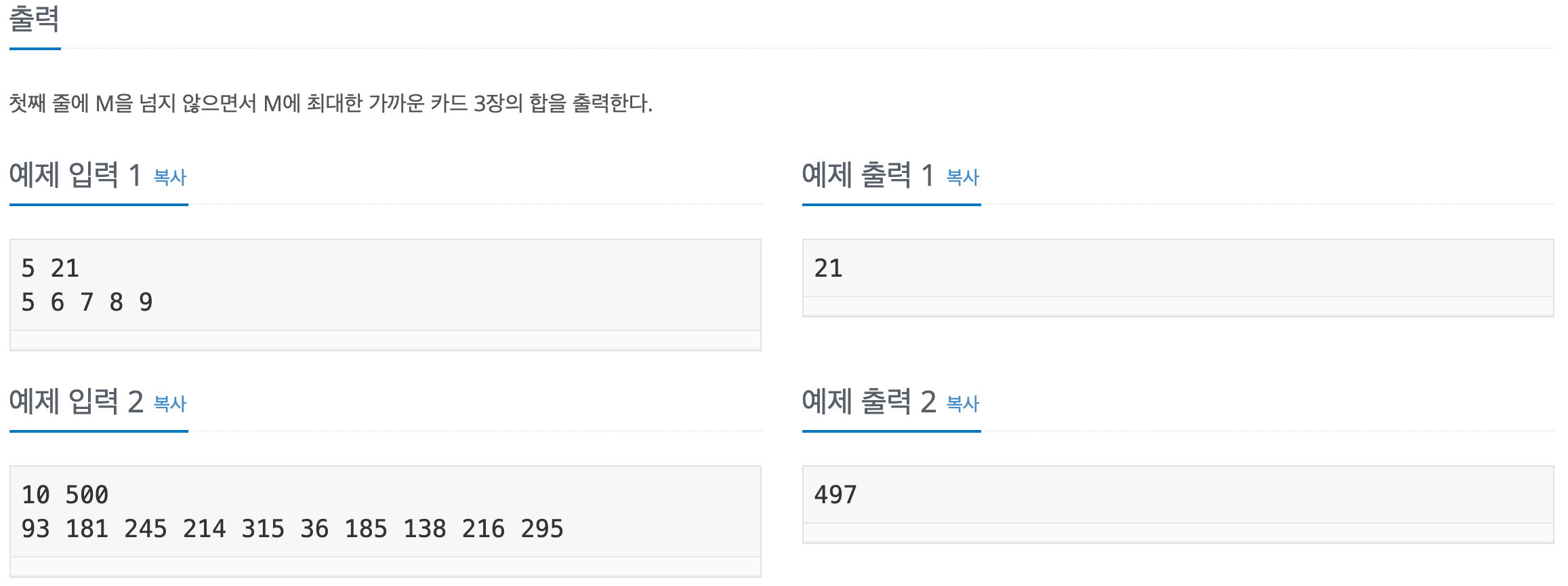 반복문으로 n번째 카드를 기준으로 삼고 그 카드를 더할수 있는 모든 경우의 수를 더해 배열에 저장후, 목표값과 가장 가까운 수를 출력하도록 했다.