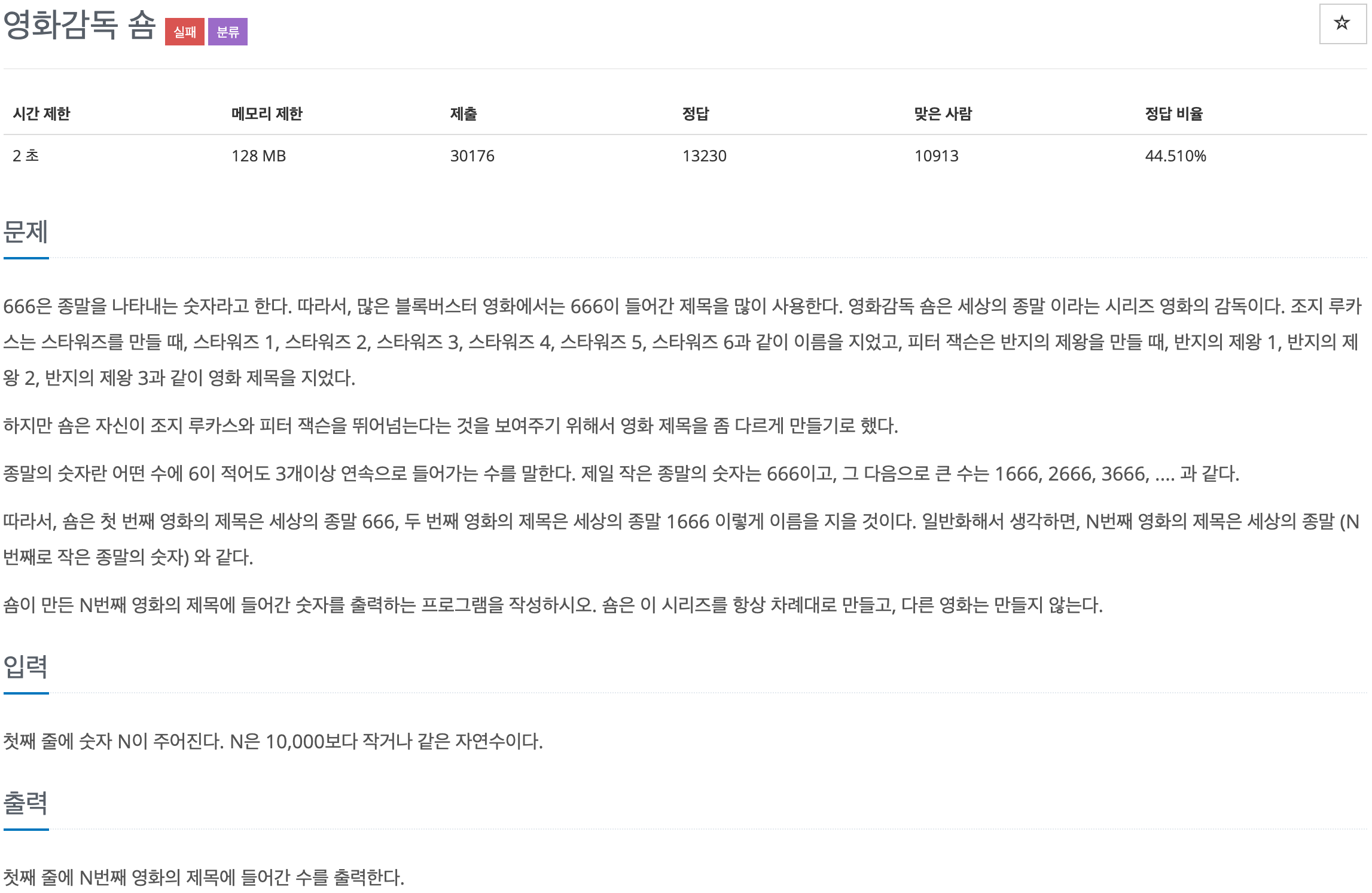 가장 간단한 방법은 1씩 더해서 그 더한 값에 666이 포함되어있으면 카운트를 올리고, 카운트가 n과 같아진다면 출력하는 방법이 가장 간단하다. 하지만 시간이 오래 걸린다.