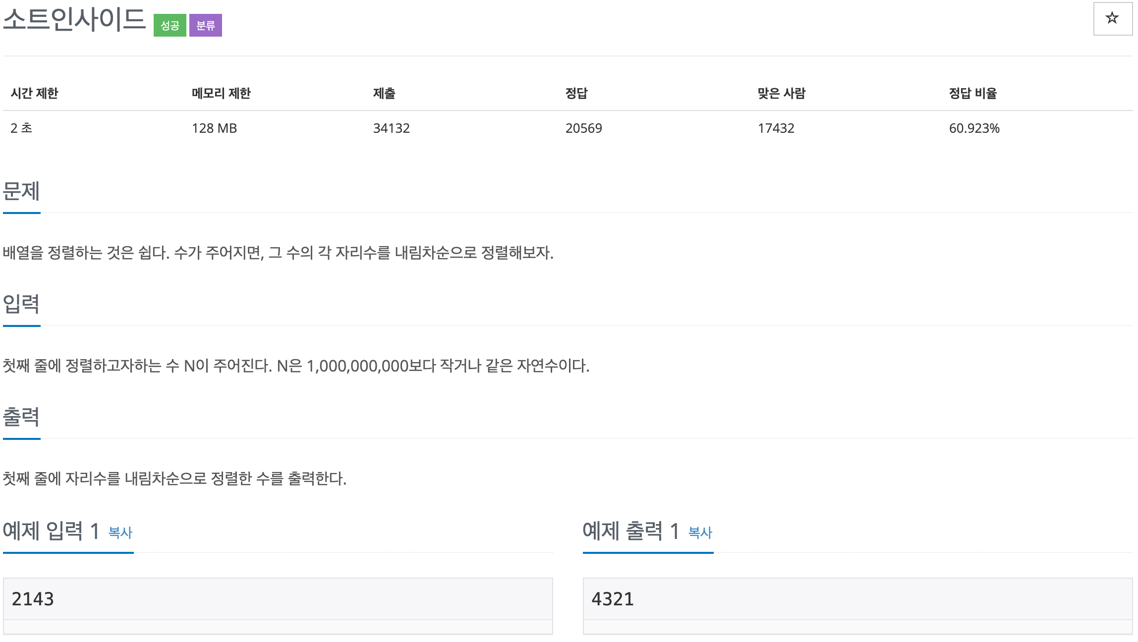 수를 입력받고, 그 수를 내림차순으로 정렬하면 되는 문제. 수를 정렬하려면, 각 숫자를 나눠야 하는데, 정수형은 일일히 나누려면 각 자릿수로 나눠야 하기에 String형태로 받고, split로 나눈후, 다시 정수형으로 변환 후 정렬을 해주었다.