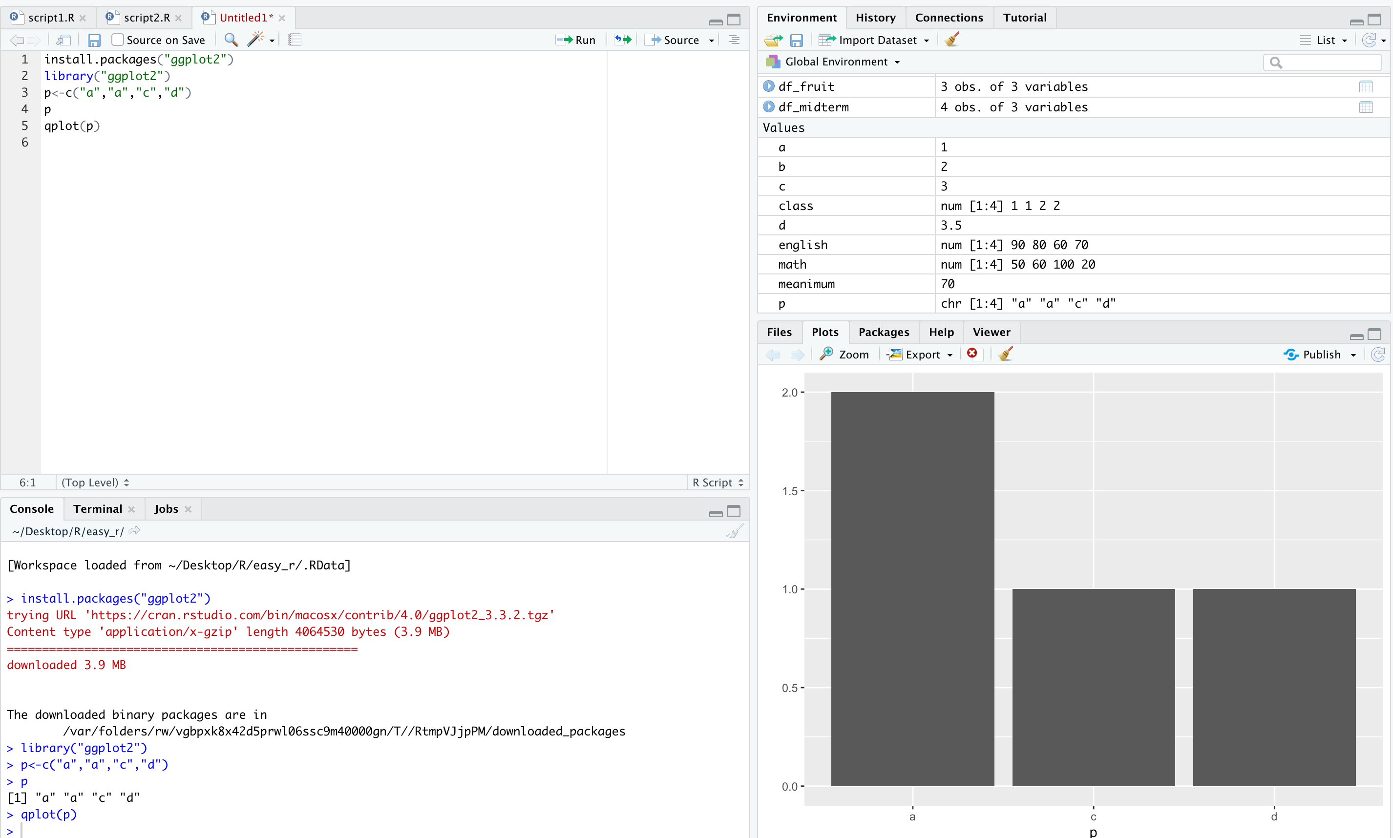 변수 p에 a,a,c,d를 집어넣었다. 그리고 qplot을 이용해 그래프로 표현했더니 a가 2, c와 d가 1로 나왔다.