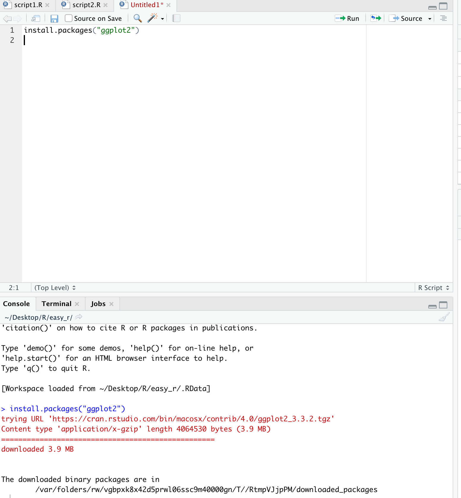 install.packages("ggplot2")를 실행시키면 패키지가 설치된다.