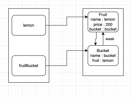 그림처럼 서로 참조가 되어있는 상태입니다. 여기서 lemon과 fruit를 nil로 참조를 끊는다고 해봅시다.