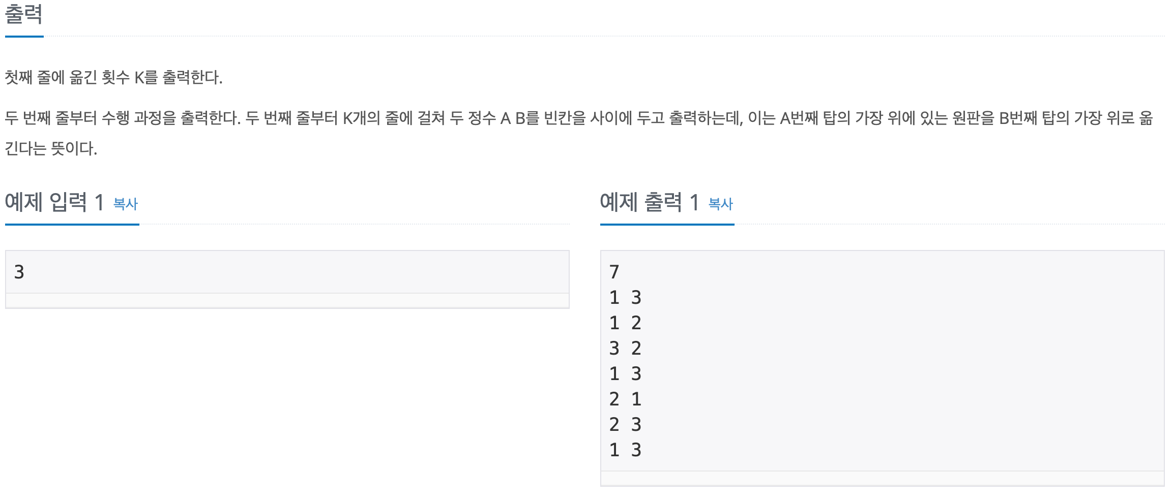 가장 큰 원판을 3번째 장대로 옮기는걸 n번 반복하면 된다. 즉 n번째의 원판을 이동시키려면 n-1번째까지의 원판을 모두 2번째 장대로 옮겨야 된다. 그 후 2번째 장대로 옮겨놓은 판을 다시 3번째 장대로 옮기기만 하면 끝.