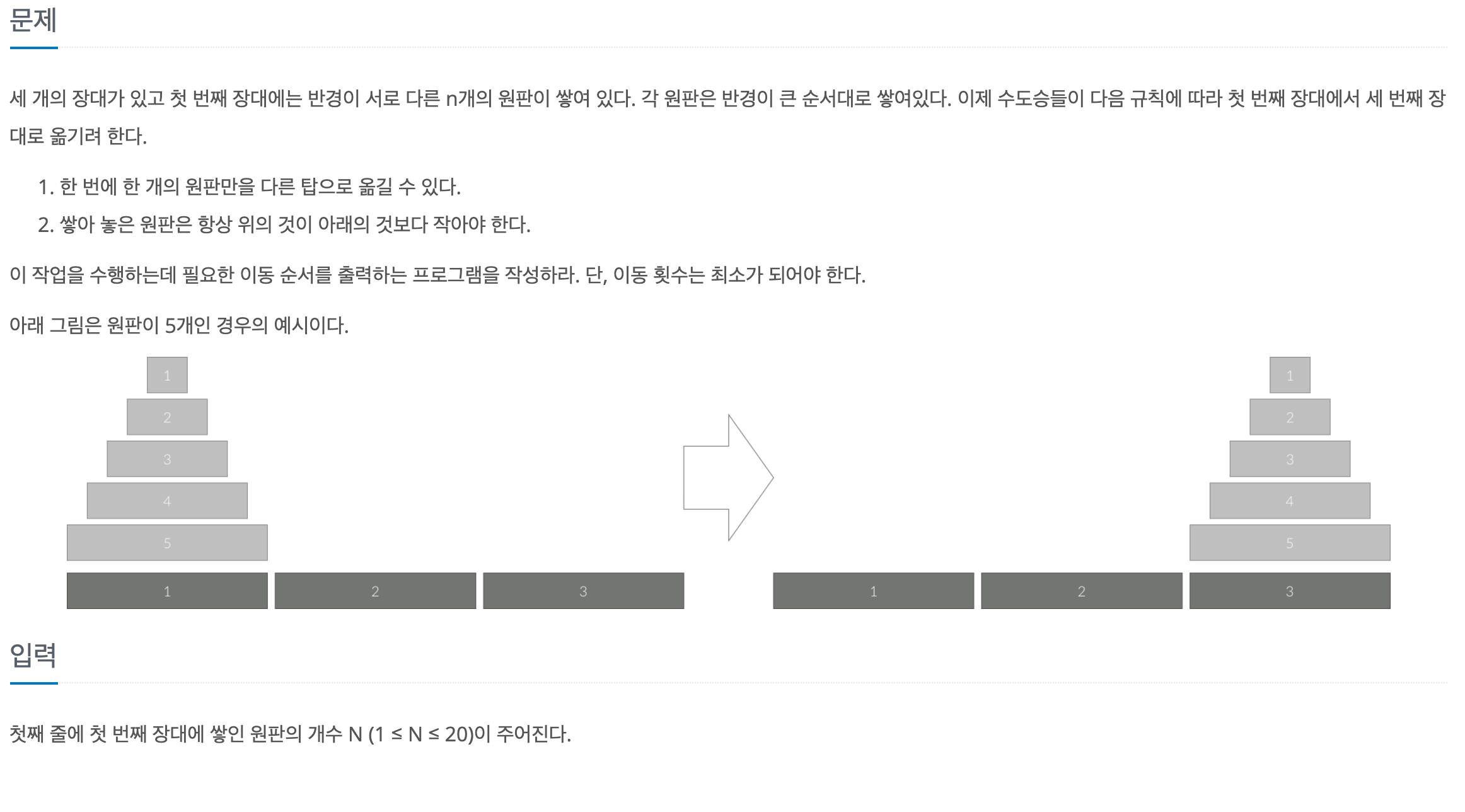 유명한 문제. 복잡하게 생각할 수록 어려운 문제다. 장대의 개수가 3개보다 많을시 난이도역시 오르는 문제. 하지만 3개여서 매우 쉽다. 분할정복을 사용해서 풀면 매우 간단하다.